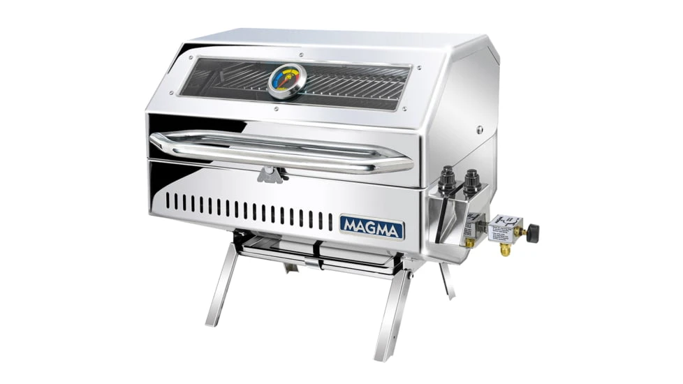 Perfect your grilling skills with Magma’s completely redesigned Catalina II Infrared Gas Grill. The perfect addition for feeding a large crew,this versatile,portable,finely crafted grill is always ready for action. New features include: an elegant exterior design,a completely redesigned combustion system that keeps the grill lit even in heavy winds,a hermetically sealed thermometer,a dependable electronic ignition system,powered by a single “AAA” battery (included),and an ultra high-temp glass viewing window. Anti-Flare Infrared technology produces intense,evenly distributed heat,eliminating Flare-Up and immediately emulsifies drippings giving your meal a great smoky flavor. The primary and secondary grilling surfaces give you the option of searing,slow cooking,or warming. Constructed entirely of 18-8 mirror-polished stainless steel to withstand even the harshest environments. Equipped with fold-away table top legs for go-anywhere use. Its fuel efficient swiveling control valve,attaches to,pre regulated,low pressure propane (LPG) fuel systems or can be adapted for use with 1lb. disposable propane fuel canisters or natural gas (CNG) fuel systems. Magma offers the largest selection of mounting options (sold separately) to customize the grill for your needs. Heavy Duty mounting hardware is recommended. Fuel canister and serving tray (not included).Not sure which grill is right for you? Check out our GRILL COMPARISON GUIDE.![]()