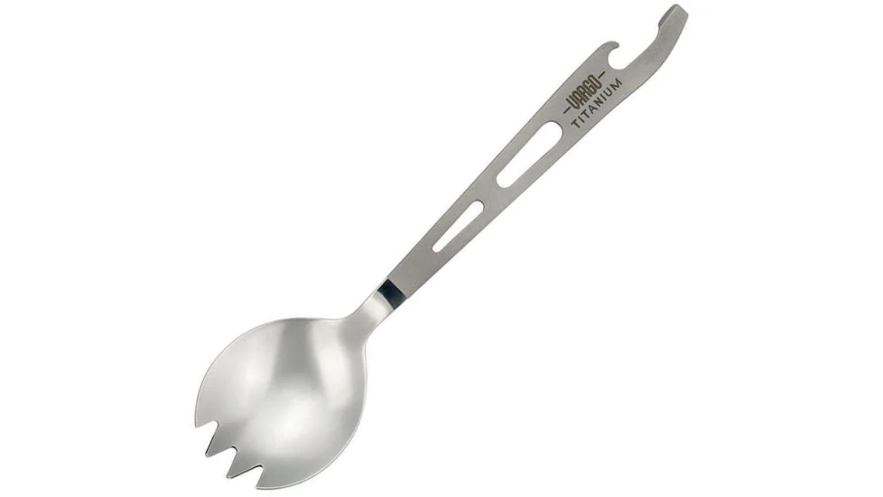 6.25″ overall. 0.4oz. Spork with integrated can/bottle opener. Titanium construction. Hang packaged.![]()